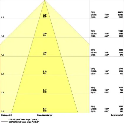 Der Abstrahlwinkel bezeichnet den Winkel, in dem das Licht aus der Lichtquelle ausgestrahlt wird. Er wird in Grad (D) angegeben. Je geringer die Gradzahl des Abstrahlwinkels ist, desto kleiner ist auch der Durchmesser des Lichtkegels, den die Lichtquelle produziert. Beispiel: Wird eine Lampe mit einem Abstrahlwinkel von 60 Grad an der Decke (2,5 m Höhe) angebracht, erzeugt sie einen Lichtkegel von 2,9 Metern Durchmesser. Hat die Lampe hingegen einen Abstrahlwinkel von 120 Grad, beträgt der Lichtkegel 8,7 Meter im Durchmesser. |