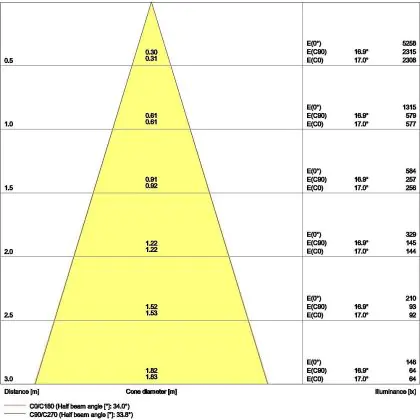 Der Abstrahlwinkel bezeichnet den Winkel, in dem das Licht aus der Lichtquelle ausgestrahlt wird. Er wird in Grad (D) angegeben. Je geringer die Gradzahl des Abstrahlwinkels ist, desto kleiner ist auch der Durchmesser des Lichtkegels, den die Lichtquelle produziert. Beispiel: Wird eine Lampe mit einem Abstrahlwinkel von 60 Grad an der Decke (2,5 m Höhe) angebracht, erzeugt sie einen Lichtkegel von 2,9 Metern Durchmesser. Hat die Lampe hingegen einen Abstrahlwinkel von 120 Grad, beträgt der Lichtkegel 8,7 Meter im Durchmesser. |