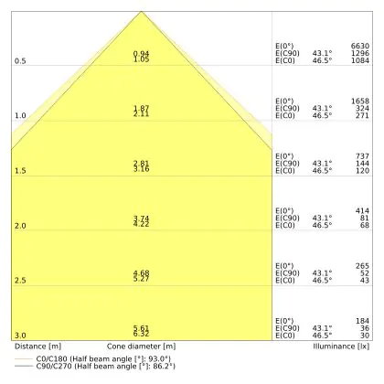 ![]() Le code couleur se compose de l'indice de rendu des couleurs (IRC) et de la température de couleur (Kelvin). Le premier chiffre indique le rendu des couleurs (1 = très mauvais rendu des couleurs, 9 = meilleure authenticité des couleurs). Le deuxième et troisième chiffre indiquent la température de la couleur. Exemple : Le code couleur "830" indique que la lampe a un bon rendu des couleurs (8) et une couleur de lumière blanche chaude (30 = 3000K). |